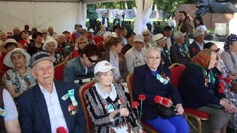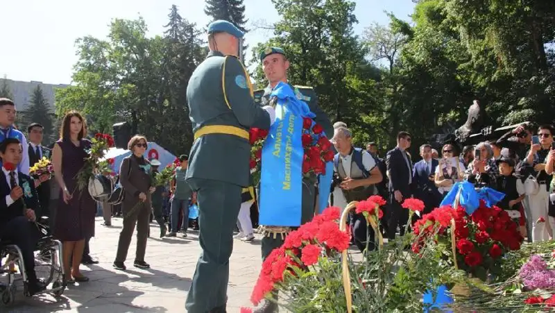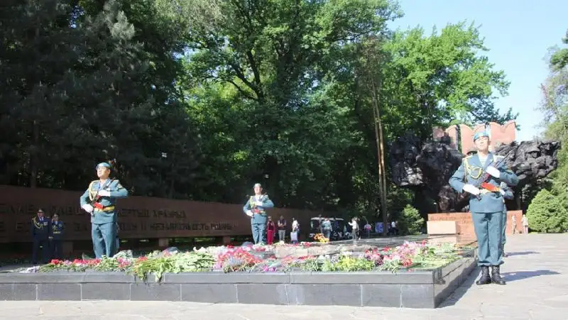 В Алматы 9 мая в Парке имени 28 героев-панфиловцев состоялось возложение цветов к Вечному огню, посвященное 77-й годовщине Победы в Великой Отечественной войне.