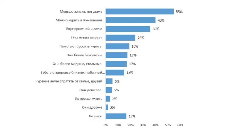 Основные «перебежчики» в выборе формата курения – это люди, которые обычную сигарету меняют на электронные форматы. Для большинства людей, выбирающих электронные форматы курения, это способ в определенном смысле сделать чище и комфортнее свое пространство. 60% казахстанцев после перехода на системы нагревания табака и вейпы отмечают, что они менее вредны, способствуют тому, чтобы бросить курить.