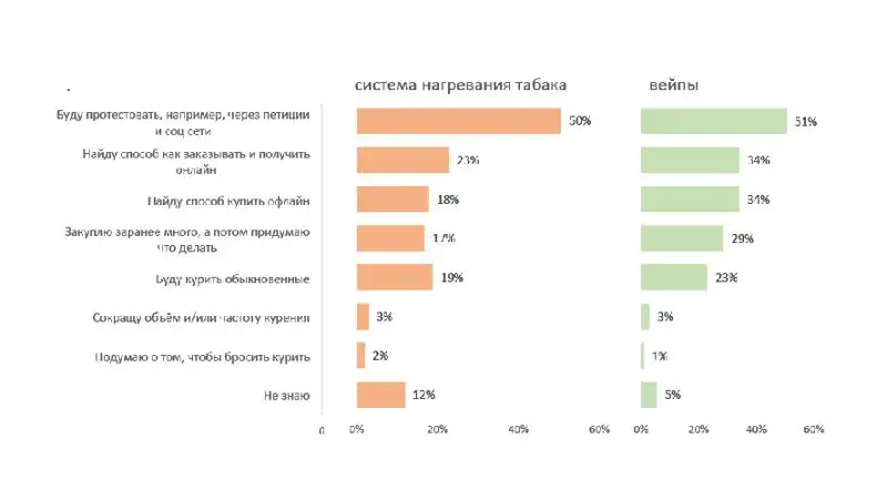 Примечателен тот факт, что в случае введения ограничений на покупку или значительное увеличение цен на вейпы и системы нагревания табака люди не откажутся от курения, а будут искать способ купить онлайн – до 34%, найдут способ, как купить – до 34%, закупят заранее много – до 29%. Высока вероятность ярких протестных мнений (основной курильщик –мужчина 26-55 лет) и поиска обходных путей покупок. Стоит ожидать, что дополнительные запреты и ограничения только придадут импульс нелегальной продаже табака.