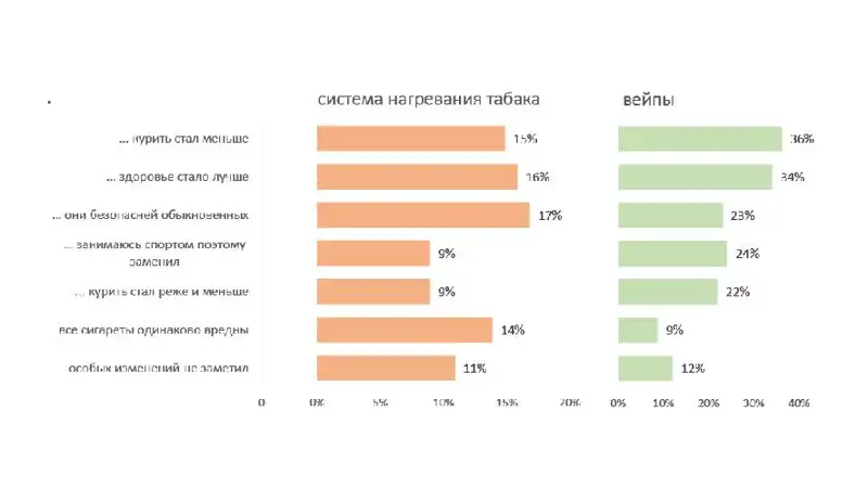 Примечательно, что уменьшение объема и частоты курения отмечают 36% среди перешедших с обычных сигарет на вейпы, и 34% отмечают, что их здоровье стало лучше. Показатели тех, кто перешел с обычных сигарет на системы нагревания табака, вдвое ниже: 15% отмечают уменьшение объема и частоты курения и 16%, соответственно, улучшение показателей здоровья.