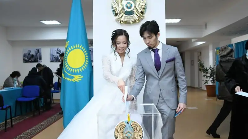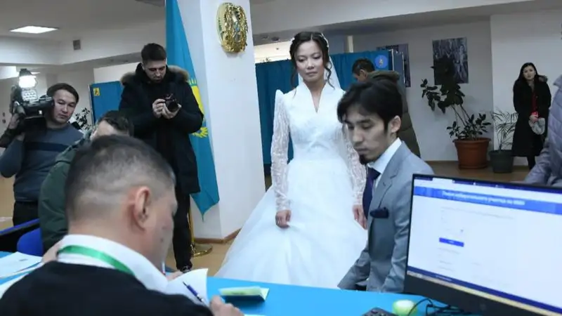 Молодая пара в день свадьбы проголосовала на избирательном участке №127 в Есильском районе столицы.