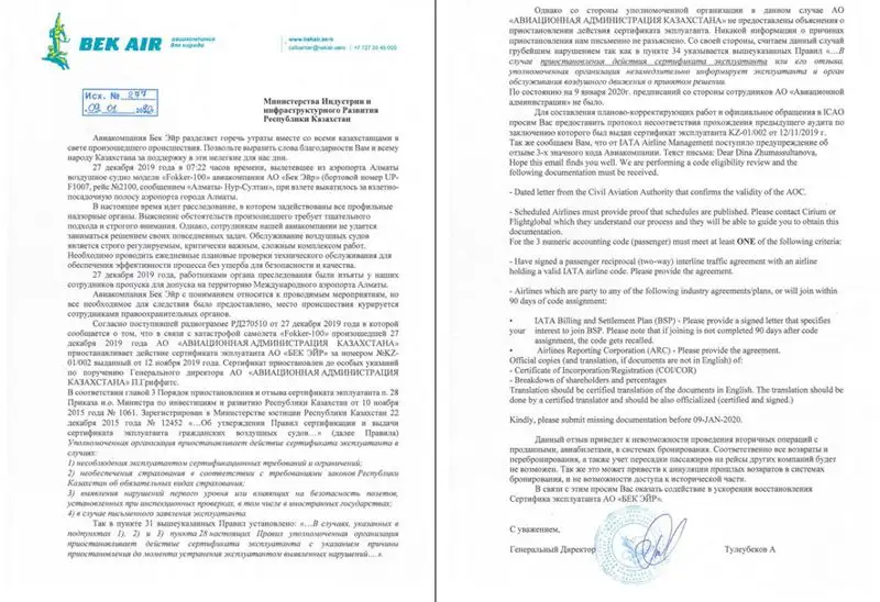 Но мы выяснили, что сразу после трагедии авиакомпания Bek Air разместила на своем сайте bekair.aero (сейчас сайт не доступен) письменное обращение в Министерство индустрии и инфраструктурного развития РК по вопросу восстановления сертификата эксплуатанта АО "БЕК ЭЙР". При этом авиакомпания "БЕК ЭЙР" использовала бланк с написанием слов "БЕК ЭЙР" на английском языке – "BEK AIR". Вот копия данного обращения:
