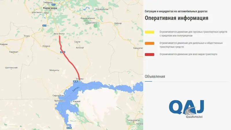 В Карагандинской области введено ограничение движения для грузового и общественного вида транспорта на автодороге Екатеринбург - Алматы (1610-1854 км, участок от пос. Аксу-Аюлы до Балхаша).