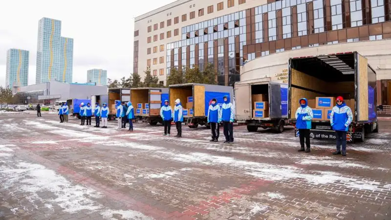 В доставке продуктовых наборов помогали волонтеры объединения "Астана Жастары". Молодежь работала организованно: распределились по группам, загрузили коробки с продуктами в грузовички и отправились по адресам. Каждая коробка весила более 40 килограммов.