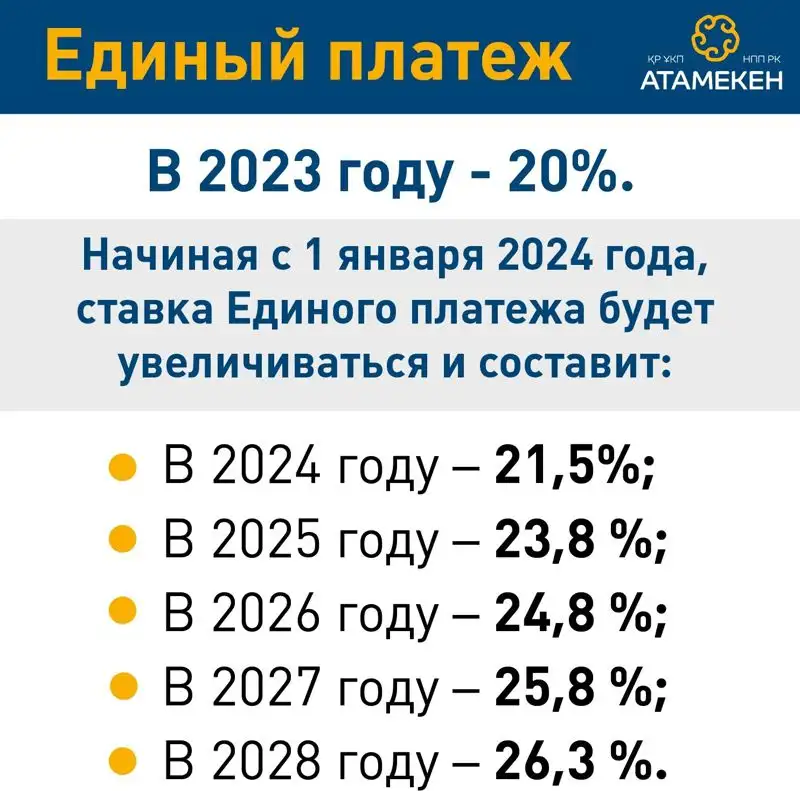 "Если раньше работодателям на своих работников необходимо было уплачивать пять видов платежей, то сейчас это один единый платеж, который уже включил в себя ИПН, обязательные пенсионные взносы в ЕНПФ, социальные отчисления в ГФСС и т.д. Его ставка для 2023 года составляет 20%. Это послужит стимулом для того, чтобы работодатели могли официально платить своим сотрудникам большую сумму в виде зарплат за счет сокращения суммы, которая была в общих расходах", - рассказал заместитель председателя правления НПП "Атамекен" Тимур Жаркенов.