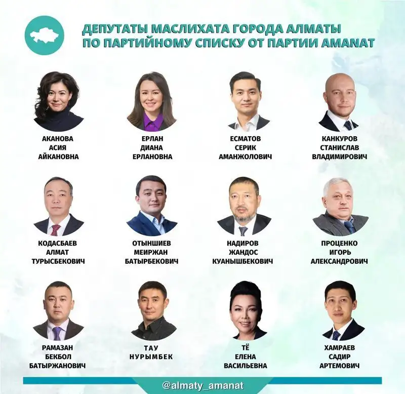Решением бюро политического совета Алматинского городского филиала партии Amanat утвержден партийный список в составе 12 депутатов и направлен в территориальную избирательную комиссию для регистрации в качестве депутатов маслихата г. Алматы VIІI созыва.
