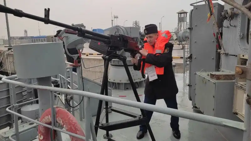"На ракетно-артиллерийском корабле "Казахстан" – три единицы вооружения. Во-первых, зенитная установка ЗУ 23-2 калибра 23 мм. Расчет состоит из двух человек: стреляющего и наводчика. Она предназначена для поражения воздушной и надводной целей, ее дальность – 2,5 км. Также есть артиллерийская установка "Утес" для противодиверсионной работы и для поражения мин. Кроме того, есть ракетная система залпового огня", – рассказал капитан-лейтенант Данияр Онарбаев, командир ракетно-артиллерийской боевой части "Казахстан".