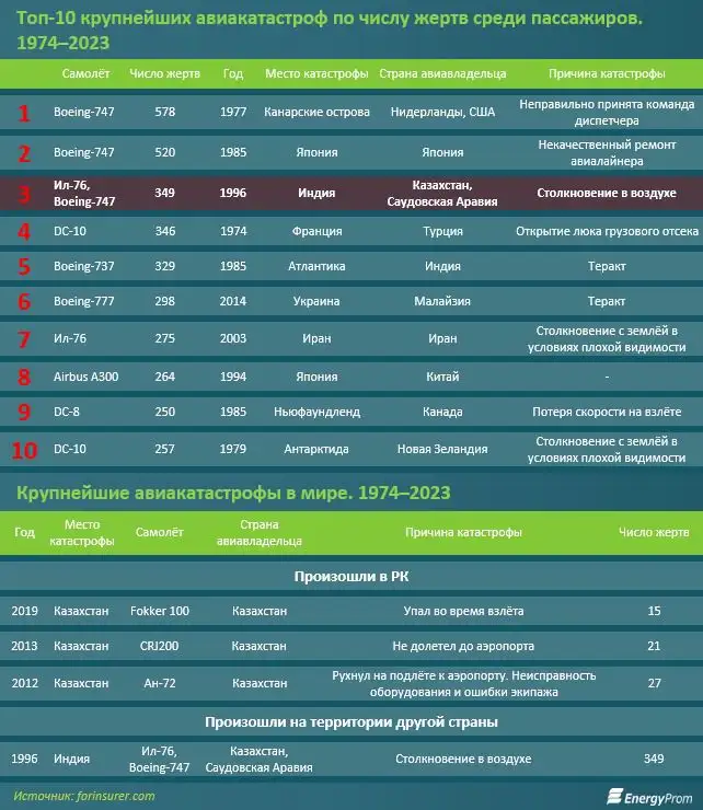 В тройку самых страшных попала и катастрофа, связанная с нашей страной. В 1996 году в Индии столкнулись в воздухе казахстанский Ил-76 (при аварии погибли 37 человек) и Boeing-747, принадлежащий авиакомпании из Саудовской Аравии (312 погибших).
