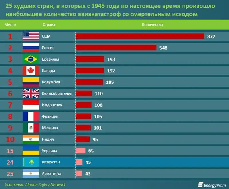 Казахстану отвели 24-е место (45 авиакатастроф).
