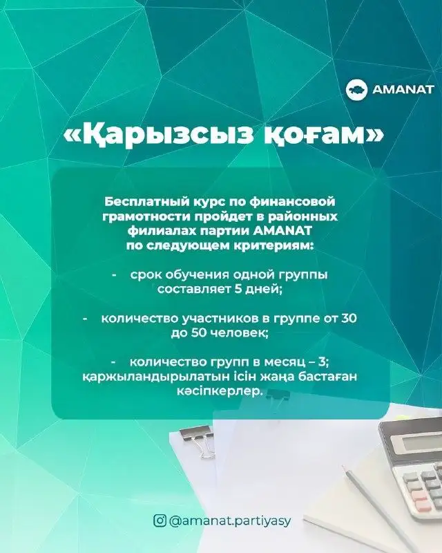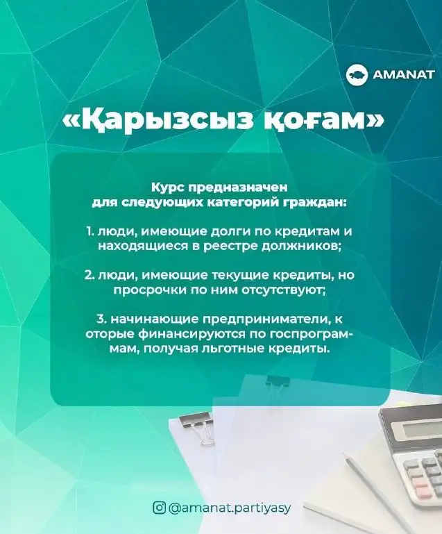 Напомним, что ранее партия Amanat и Halyk Bank заключили меморандум о запуске проекта "Қарызсыз қоғам". Его финансирование осуществляет Halyk bank. Главная цель проекта – повышение уровня финансовой грамотности, особенно среди проблемных заемщиков (физических лиц). Обучение продлится до конца текущего года.