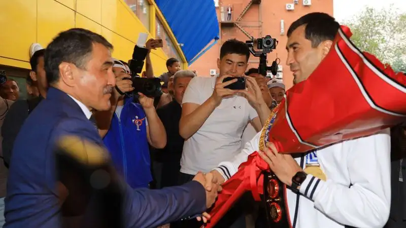 Аким области вручил чемпиону мира Асланбеку Шымбергенову ключи от 3-комнатной квартиры, его личному тренеру Ермеку Ертаеву – сертификат на 5 млн тенге.