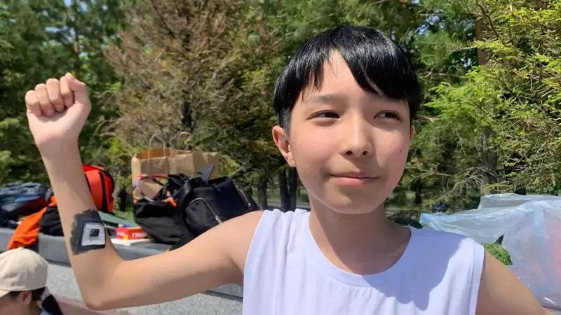 Ее сын, 11-летний Эмир, показал результаты дня на своей руке.