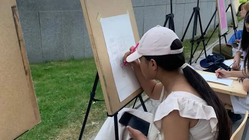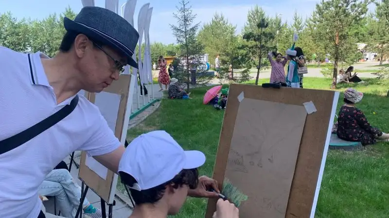 А чуть дальше можно увидеть пленэр, в котором также участвуют ученики школы. Преподаватель художественного отделения Даурен Бейсенбаев рассказал, что сегодня летнюю практику на природе приурочили к 1 июня.