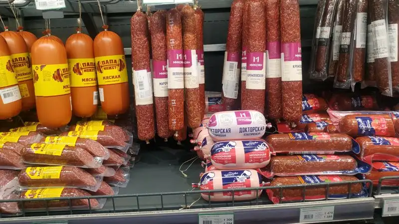 Большой выбор колбасной продукции: колбаса "Халял" по 2791 тенге за кг, колбаса "чайная" по 1865 тенге, колбаса "Марочная" от российских производителей по 4974 тенге и совсем уж не бюджетная – копченая "Пепперони" по 6502 тенге.