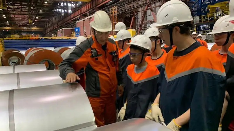 Знакомство с производственными объектами началось с конвертерного цеха АО "АрселорМиттал Темиртау", где участники экскурсии почувствовали жар металла и увидели стальные плиты, из которых потом производят прокат.