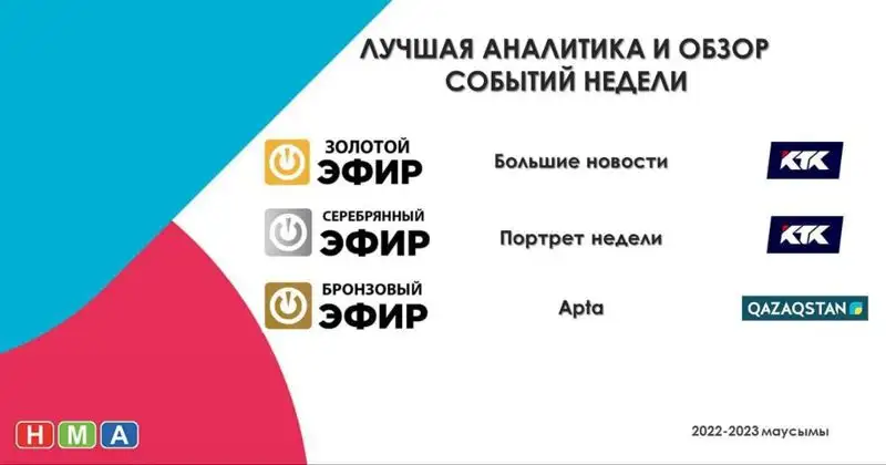Национальная медиа ассоциация (НМА) Казахстана ко Дню работников СМИ определила топ-3 ("Евразия", КТК, Qazaqstan) телевизионных проектов года в разных номинациях, сообщает Zakon.kz.