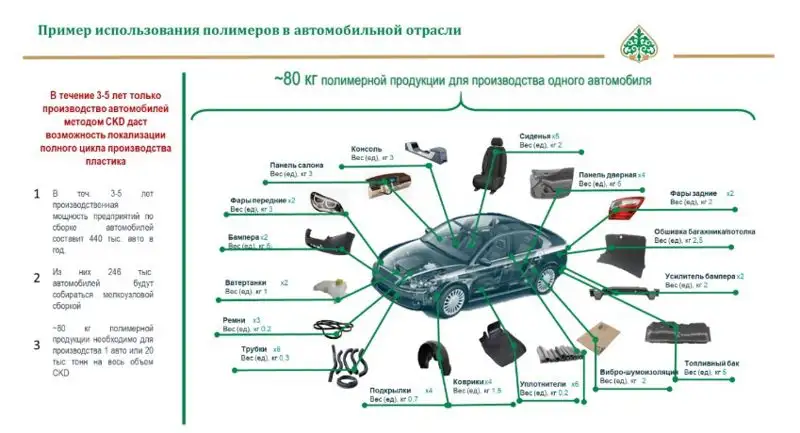 – Давайте посмотрим на примере автомобилестроения. Чтобы произвести один автомобиль используется 80-100 кг полимерной продукции – это самые разные детали (смотрите на слайде ниже). И это все мы можем выпускать сами.