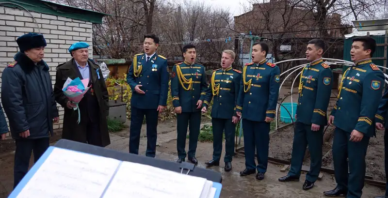Военнослужащие пожелали фронтовику здоровья и долгих лет жизни, а солисты Центрального ансамбля и хора Национальной гвардии исполнили для него песни военных лет.