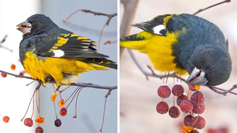 "Наш тянь-шаньский попугай – так я называю арчового дубоноса. Красивая яркая птичка и правда похожа на попугая, хотя конечно, к ним не относится. Зимой спускается с гор. Нередко, особенно в морозы можно увидите и в городе. Как например, встретил я этого пернатого в своем дворе", – подписал пост фотограф.