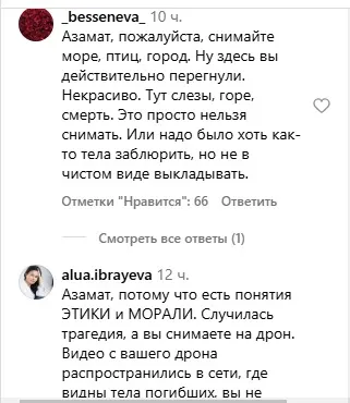 - Азамат, потому что есть понятия этики и морали. Случилась трагедия, а вы снимаете на дрон. Видео с вашего дрона распространились в сети, где видны тела погибших, вы не думали, какого родственникам погибших, кто мог опознать в этих телах своих родных? Я конечно понимаю, контент хотелось сделать, но есть границы, которые не должны пересекаться
