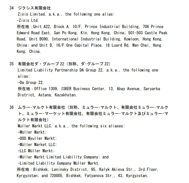 Согласно информации на сайте Министерства иностранных дел Японии, из Казахстана под экспортные санкции попала компания Da Group 22, базирующаяся в Астане.