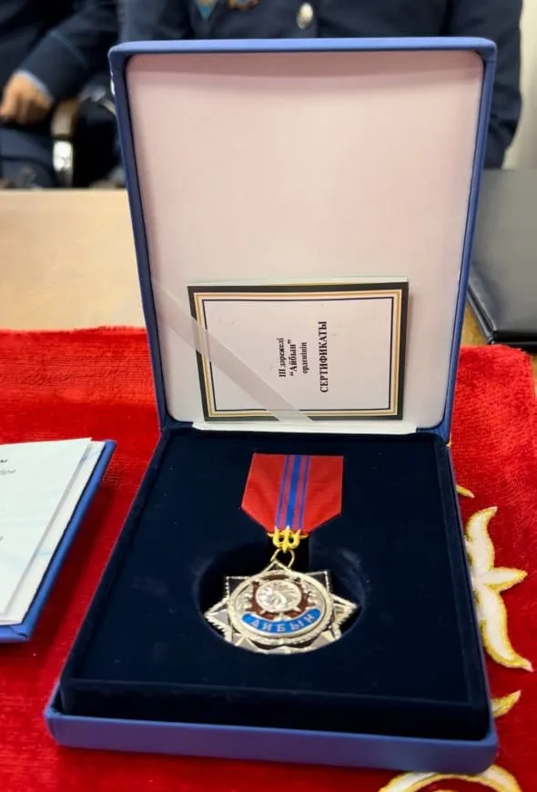 "Инспектор службы батальона патрульной полиции Алматинской областной полиции старший лейтенант полиции Шалхар Байжомартов, трагически погибший при исполнении служебного долга, удостоен ордена "Айбын" ІІІ степени".