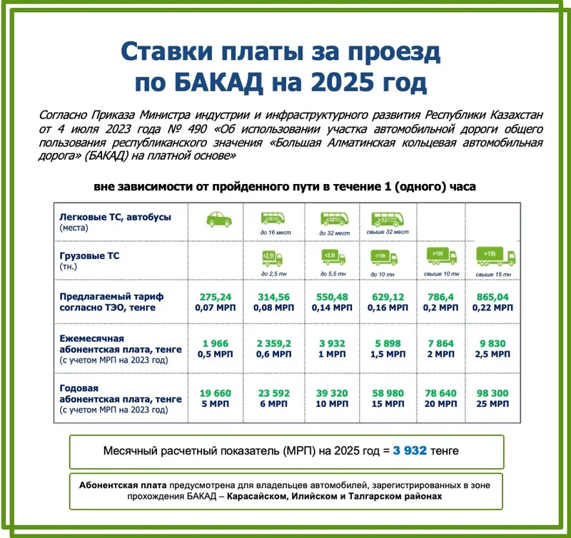Для транспортных средств, зарегистрированных в Карасайском, Илийском и Талгарском районах, доступны льготные абонементы. Более подробную информацию можно получить на официальном сайте БАКАД по ссылке: (barr.kz).