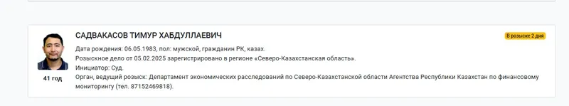 Информация появилась на сайте органов правовой статистики и специальных учетов. В розыск Садвакасова объявил суд по инициативе Департамента экономических расследований по Северо-Казахстанской области.