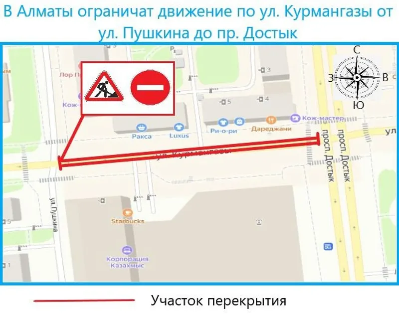 С 09:00 до 15:00 15 марта 2025 года в Алмалинском районе Алматы будет затруднено движение автотранспорта по улице Курмангазы от проспекта Достык в сторону улицы Пушкина, сообщает Zakon.kz.