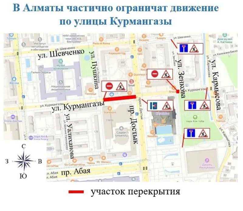 По информации ТОО "Алматинские тепловые сети" от 9 апреля 2025 года, с 9:00 11 апреля до 6:00 14 апреля 2025 года в Медеуском районе будет ограничено движение автотранспорта по улице Курмангазы от улицы Пушкина до проспекта Достык, а также на пересечении улиц Курмангазы и Зенкова.