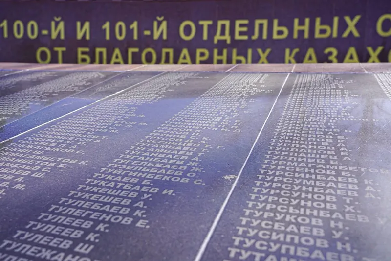 На мраморных плитах выгравированы фамилии почти десяти тысяч воинов, призванных в эти бригады из Казахстана.