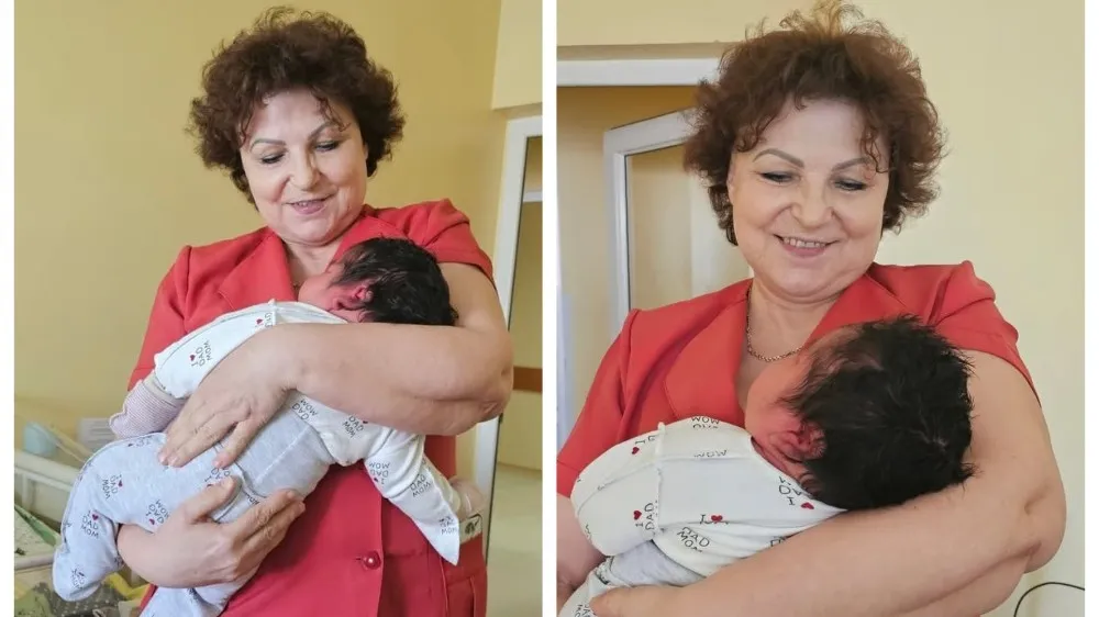 Перинатальный центр также опубликовал фотографии новорожденного на руках у акушерки Светланы Борисовой.