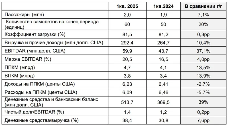 - Показатель EBITDAR вырос на 37,1% до 59,9 млн долларов (1 кв. 2024: 43,7 млн долларов). Маржа EBITDAR увеличилась на 4,0 п.п. до 20,5% (1 кв. 2024: 16,5%).