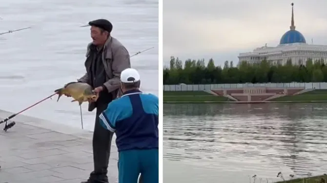В социальной сети распространилось видео, на котором мужчина вытащил из реки Есиль крупную рыбу. Рыбак и его коллеги активно фотографировались с увесистым уловом прямо напротив резиденции президента Казахстана, сообщает Zakon.kz.