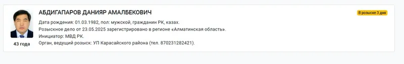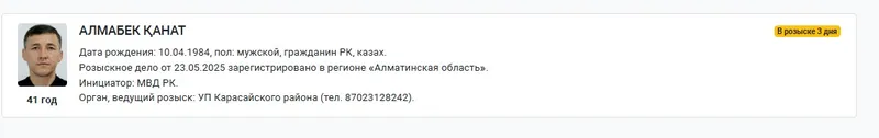 Согласно информации на портале органов правовой статистики и специальных учетов, инициатор розыска – Министерство внутренних дел, ведет его Управление полиции Карасайского района Алматинской области, дело о розыске зарегистрировано 23 мая 2025 года.
