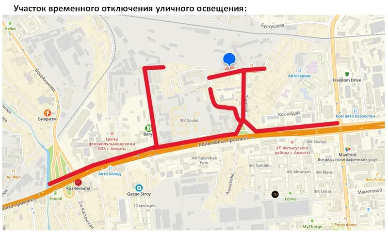 "В связи с проведением ремонтных работ на проезжей части по пр. Райымбека (северная сторона), на участке от пр. Сейфуллина до ул. Бокейханова в период до 2 июня будет временно отключено уличное освещение. Отключение затронет прилегающие улицы: Гончарная, 2, Торетай и Аргымак", – сообщили в акимате.
