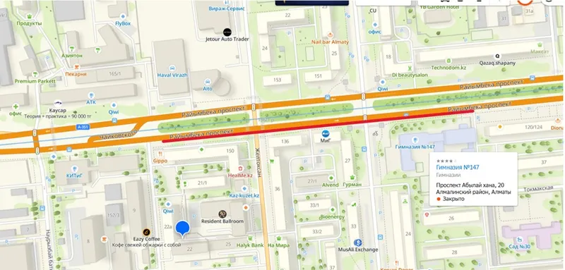 1. С пр. Райымбека, 348/1 до пр. Райымбека 451А, Ауэзовский район (по южной и северной стороне параллельно).