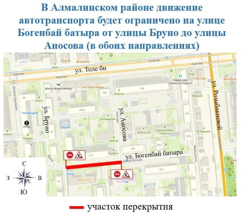 По данным Almaty_Joly, в Алмалинском районе с 31 мая по 20 июля – ограничение на ул. Богенбай батыра от ул. Бруно до ул. Аносова (в обоих направлениях).
