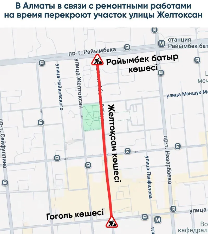 Так, с 08:00 до 22:00 2 июля 2025 года движение будет перекрыто на участке от улицы Гоголя до проспекта Райымбек батыра.