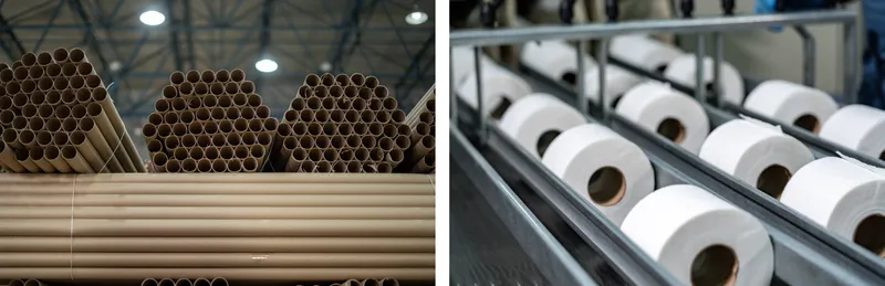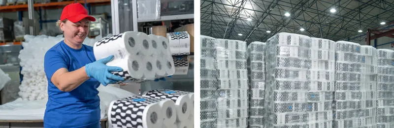 В процессе производства на бумагу наносят уникальный рисунок бренда. Также на поточной линии машина склеивает два или три слоя целлюлозы (в зависимости от вида продукции), накручивает широкую ленту бумаги на длинные втулки и, наконец, разрезает на рулоны.