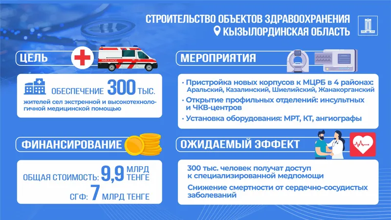 "Средства направлены на строительство новых корпусов при центральных районных больницах в Аральском, Казалинском, Шиелийском и Жанакорганском районах".Пресс-служба правительства РК