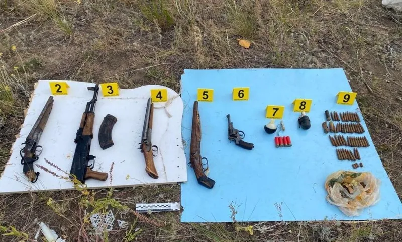 "Изъято 45 единиц огнестрельного оружия, из них 6 автоматов "Калашникова", 18 пистолетов разных модификаций, 14 охотничьих ружей, 7 обрезов, а также 6 гранат, 2 тротиловые шашки и более 400 единиц боеприпасов".Пресс-служба КНБ РК