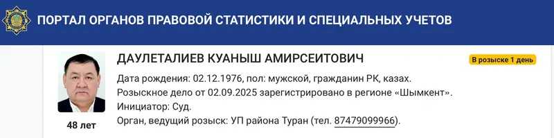 "Даулеталиев Куаныш Амирсеитович. В розыске 1 день... Розыскное дело от 02.09.2025 зарегистрировано в регионе "Шымкент". Инициатор: Суд. Орган, ведущий розыск: УП района Туран".