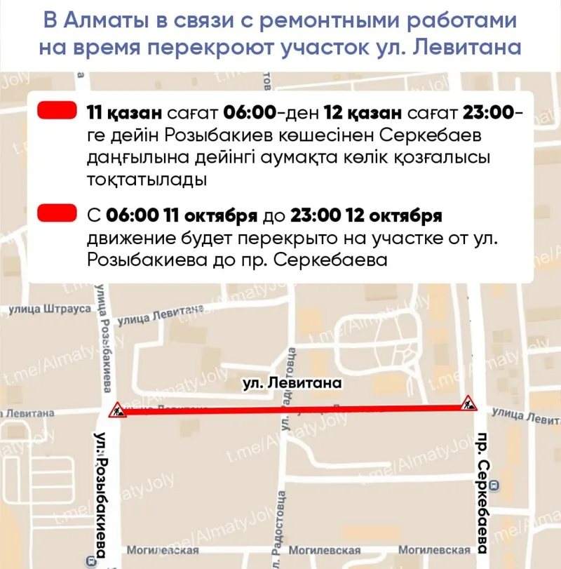 "С 06:00 11 октября до 23:00 12 октября движение будет перекрыто на участке ул. Левитана от ул. Розыбакиева до пр. Серкебаева".