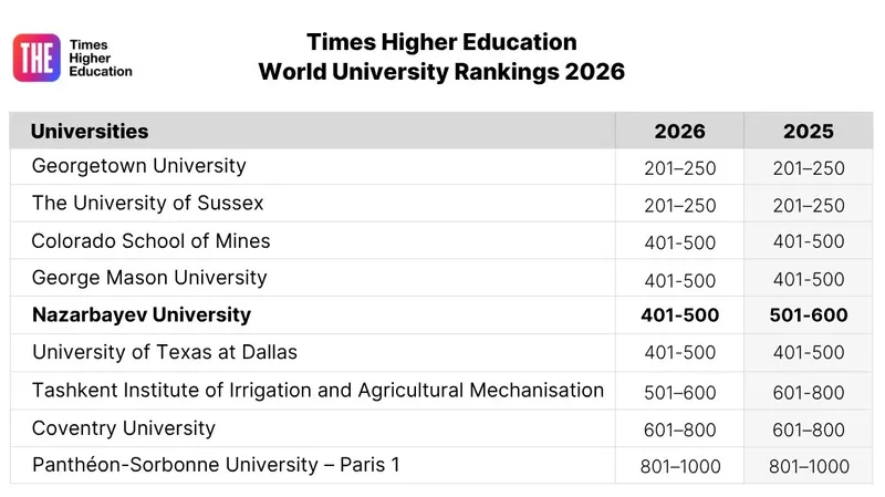 Среди стран Центральной Азии представлены университеты Казахстана, Узбекистана и Азербайджана, причем "соседи" наступают уже на пятки. К примеру, Ташкентский институт инженеров ирригации и механизации сельского хозяйства в рейтинге идет после NU, а Азербайджанский государственный университет экономики расположился на 801+ месте, далее – Ташкентский государственный технический университет. Это говорит о том, что центральноазиатские страны понимают ценность участия в мировых рейтингах и активно инвестируют в образование и науку.