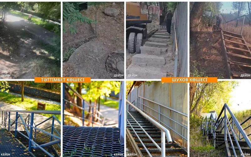 В рамках проекта обновлены лестницы по следующим адресам: Терренкур – 36 м, ул. Тәттімбет – 34 м, ул. Коккинаки – 36,6 м, ул. Розы Баглановой – 39,5 м, ул. Шухова – 104 м, пр. аль-Фараби – угол ул. Луганского – 30 м, вдоль речки Есентай – угол ул. Ахмедиярова – 5 м.
