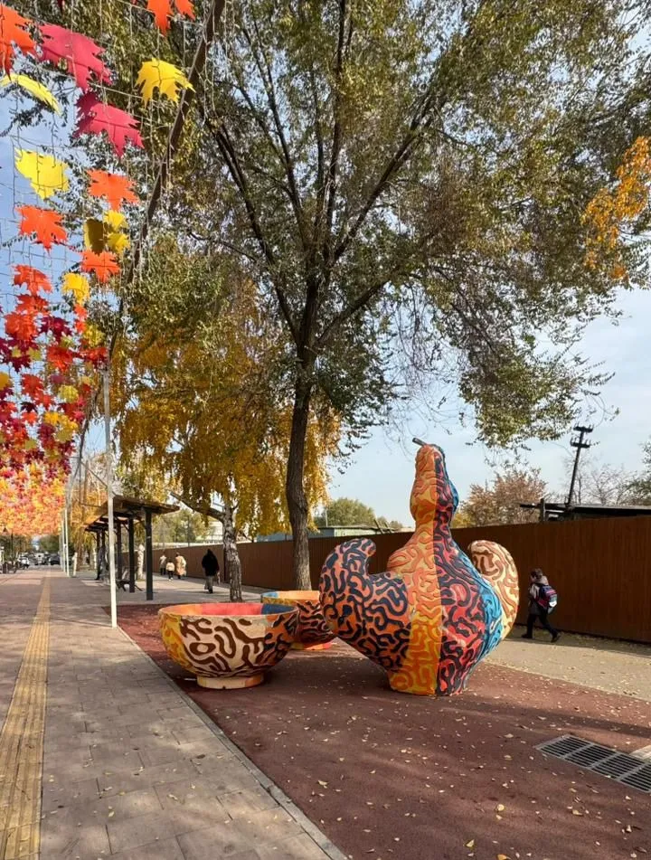 Кроме того, в пешеходной зоне появились уникальные арт-объекты – декоративная арка в виде юрты и надпись с названием микрорайона. Особое внимание уделено созданию яркой пиксельной площадки для детей, которая стала новым центром притяжения для семейного отдыха.