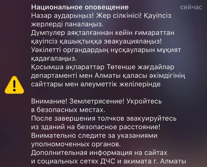 "Внимание! Землетрясение! Укройтесь в безопасных местах. После завершения толчков эвакуируйтесь из зданий на безопасное расстояние! Внимательно следите за указаниями уполномоченных органов. Дополнительная информация на сайтах и в социальных сетях ДУС и акимата Алматы", – говорится в национальном оповещении, которое получили алматинцы в четверг.