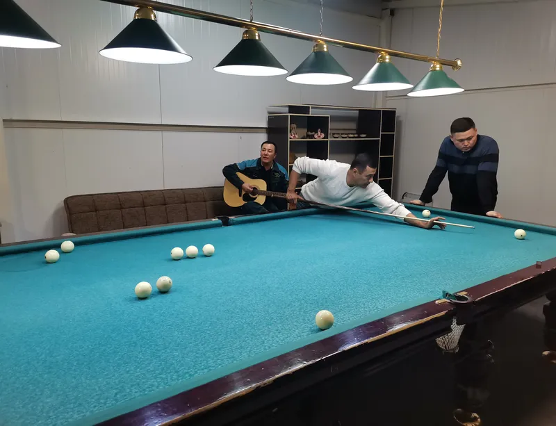 В 19:00 в ГОКе по графику ужин. Затем свободное время: можно позаниматься в тренажерном зале и поиграть в бильярд. А кто-то предпочитает помузицировать на гитаре. Вот только допоздна никто не засиживается, ведь утром наступает новый трудовой день.