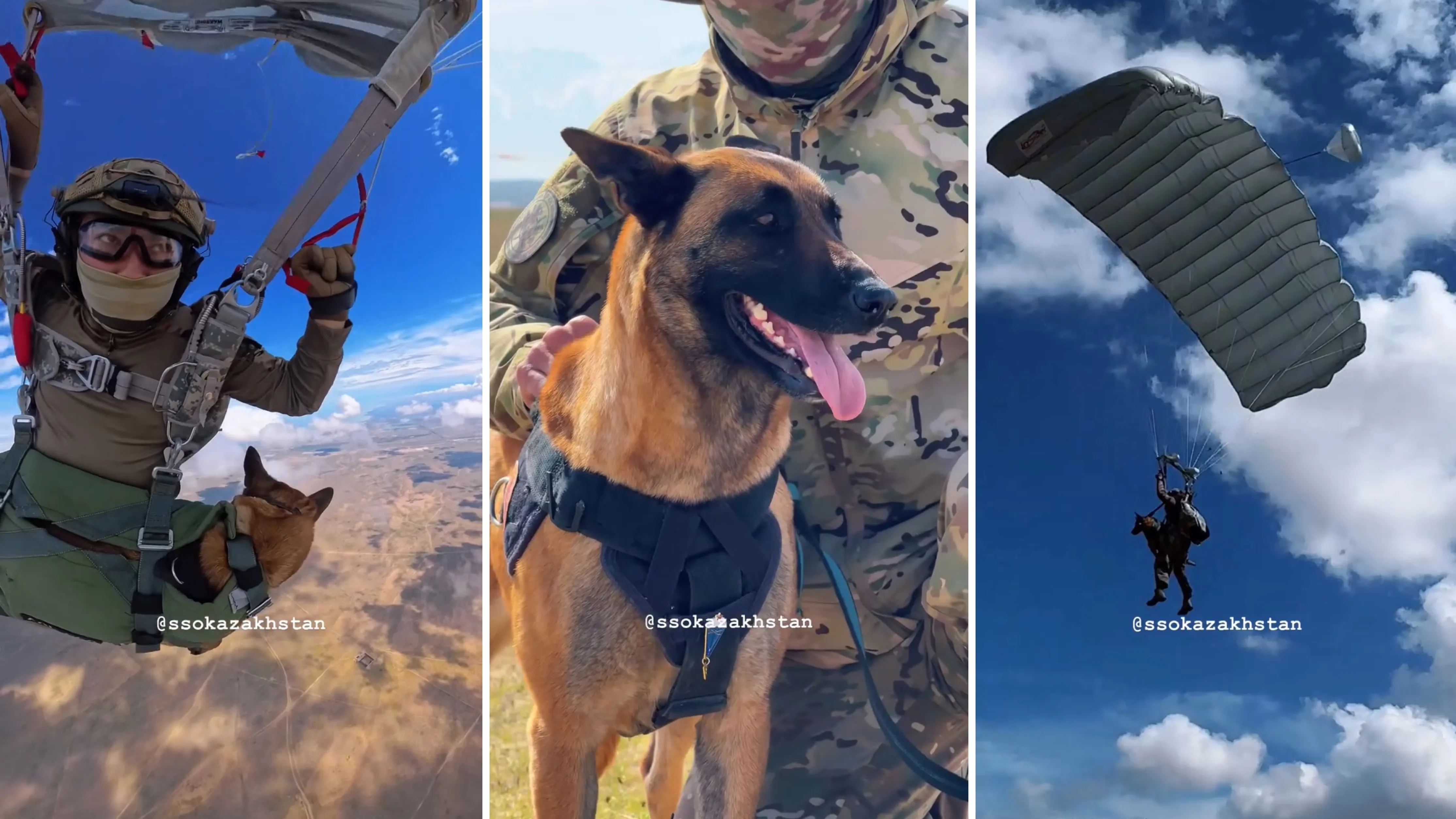 "Как скучно я живу": собака из армии Казахстана взорвала соцсети прыжком с парашютом